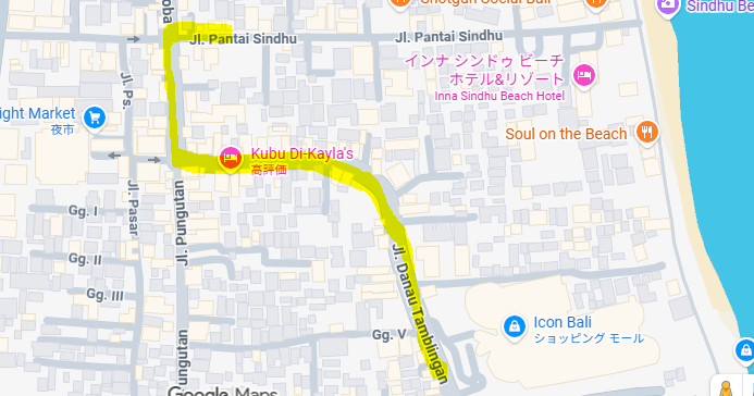 Icon Bali(ショッピングモール)周辺から北へ進み、Pantai Sindhu(パンタイ・シンドゥ)通りのビーチ側へ少し入ったあたりまでです。